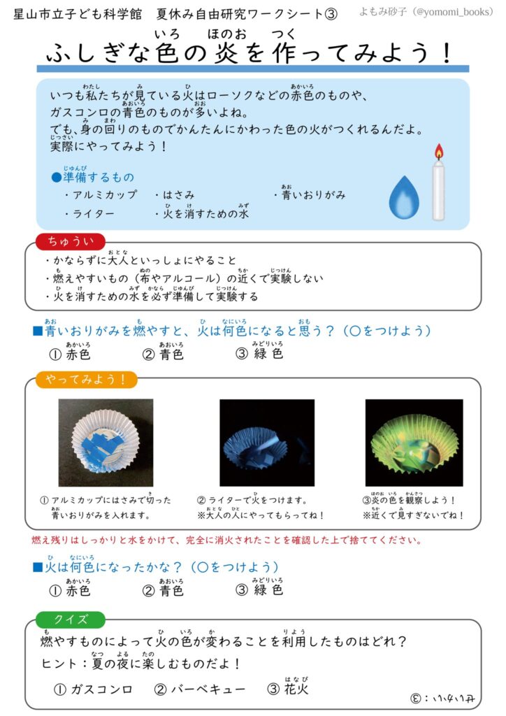 星山市立子ども科学館・自由研究おうえんワークシート 2023-09-27 とくべつ企画 ⭐️夏休みもそろそろ折り返しですね!星山市立子ども科学館では自由研究おうえんワークシートを配布しています🌻 お盆の時期にストルムの迎え火。染料に含まれる銅の炎色反応で緑色に燃えます。フクイデストの皆様は是非これで伏井出先生の霊を迎えてください。(火の扱いにはご注意ください) 目次 おまけSS 関連記事 おまけSS 関連記事